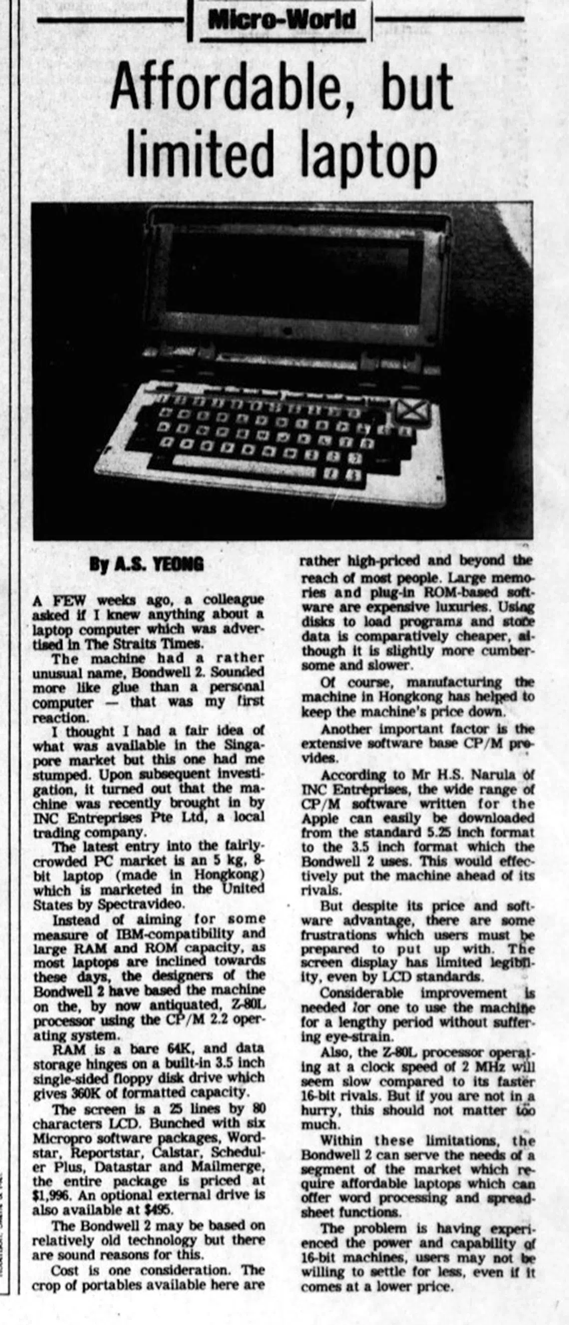 Another laptop, the Bondwell 2, was also written about in Section Two on Sept 9, 1985. It sold for about $2,000, which included software packages.