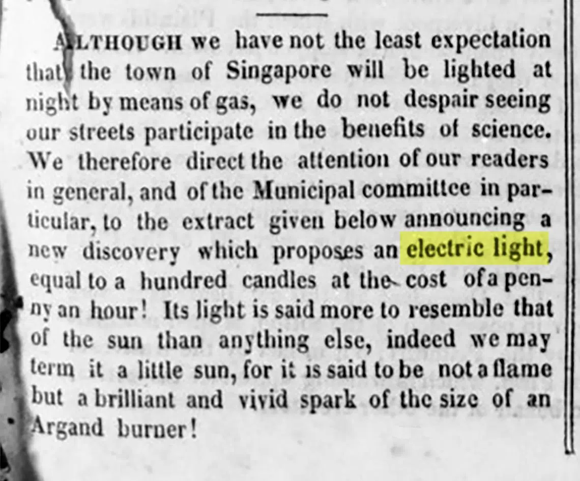 That same year, another report on Nov 22 announced that electric lighting and fans would be installed at a new pavilion at the Singapore Cricket Club, and that the price of electricity had fallen greatly from an initial estimate of 40 cents per unit to 25 cents per unit. In all, 24 fans and 132 lamps would be powered this way.