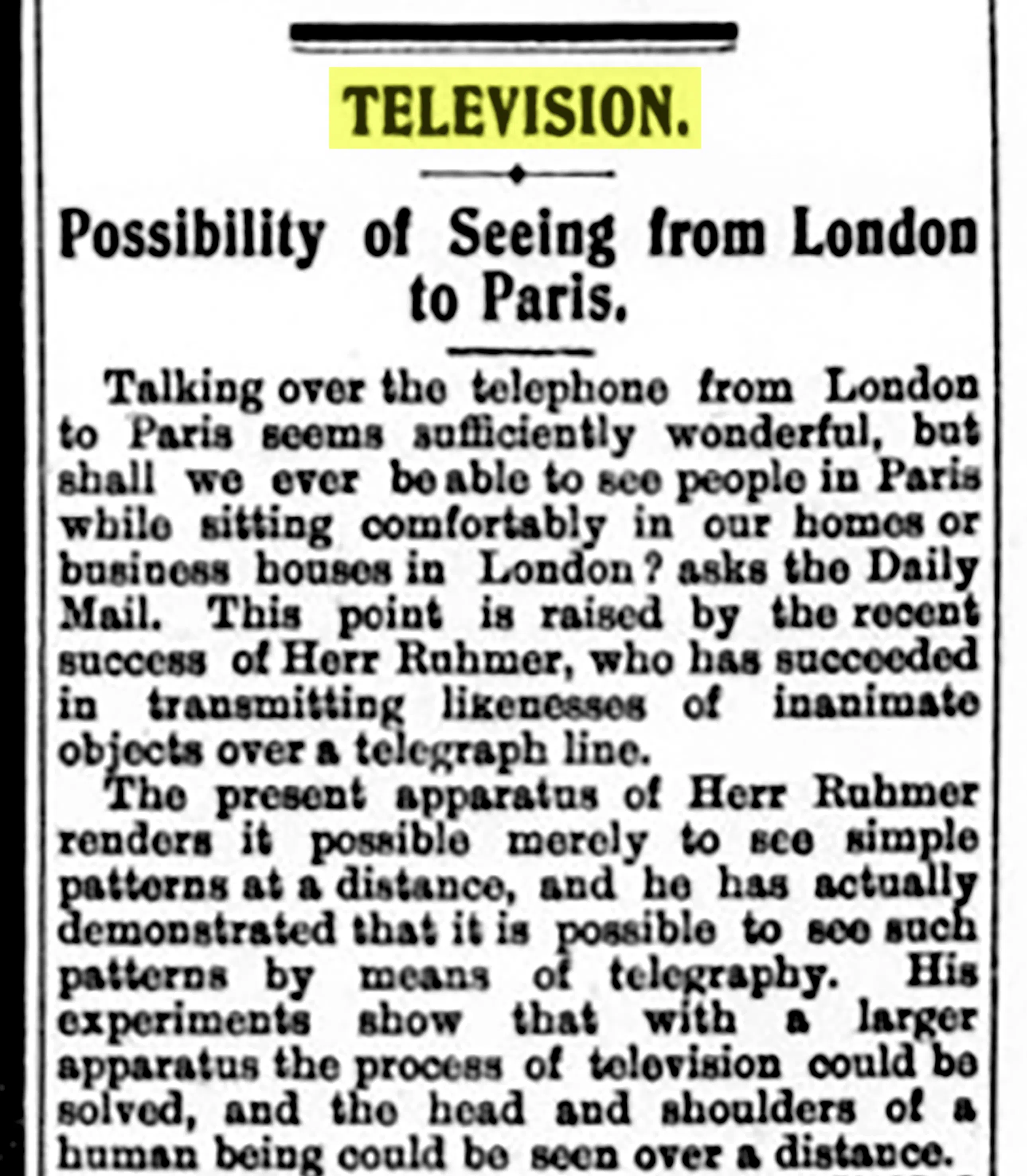 The word “television” appeared in the paper on Jan 10, 1910, when an article talked about the possibility of one day being able to see people in Paris while sitting at home in London.