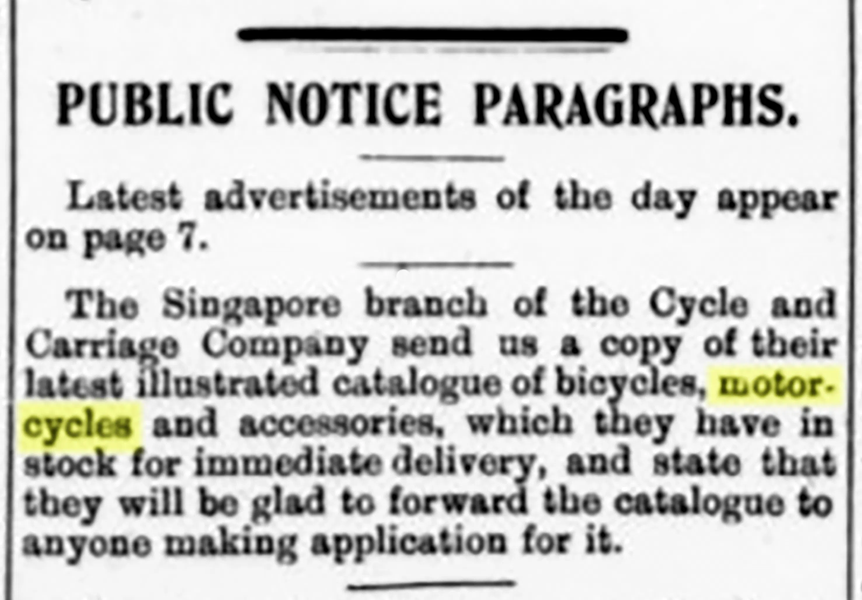 In 1916, it opened a branch in Orchard Road in Singapore, and in an article on Aug 25, 1916, reportedly had an “illustrated catalogue” of bicycles, motorcycles and accessories, in stock for immediate delivery at the Singapore branch.