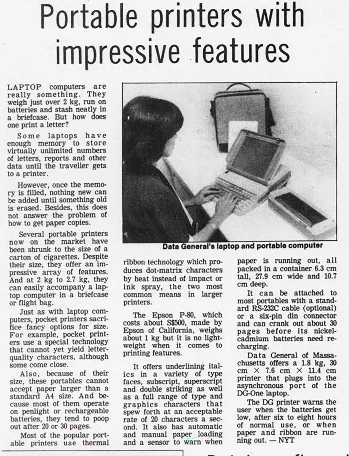 One of the first mentions of the word “laptop” appeared on May 13, 1985, in ST’s Section Two. It was used to describe the Kaypro 2000.