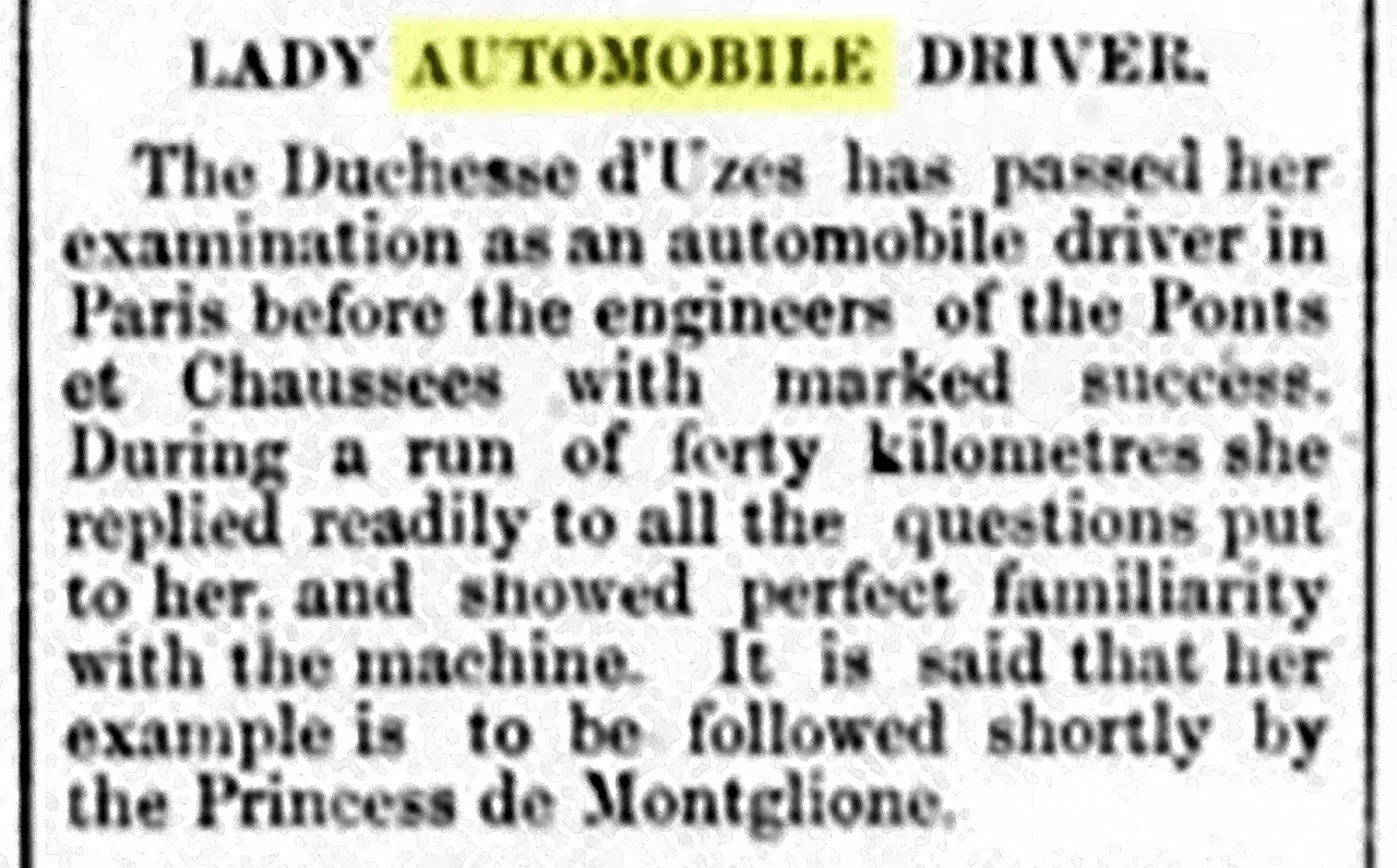 One of the earliest mentions of the word “automobile” in The Straits Times was on June 25, 1898, in an article that referred to the French Duchess of Uzes as a “lady automobile driver”.