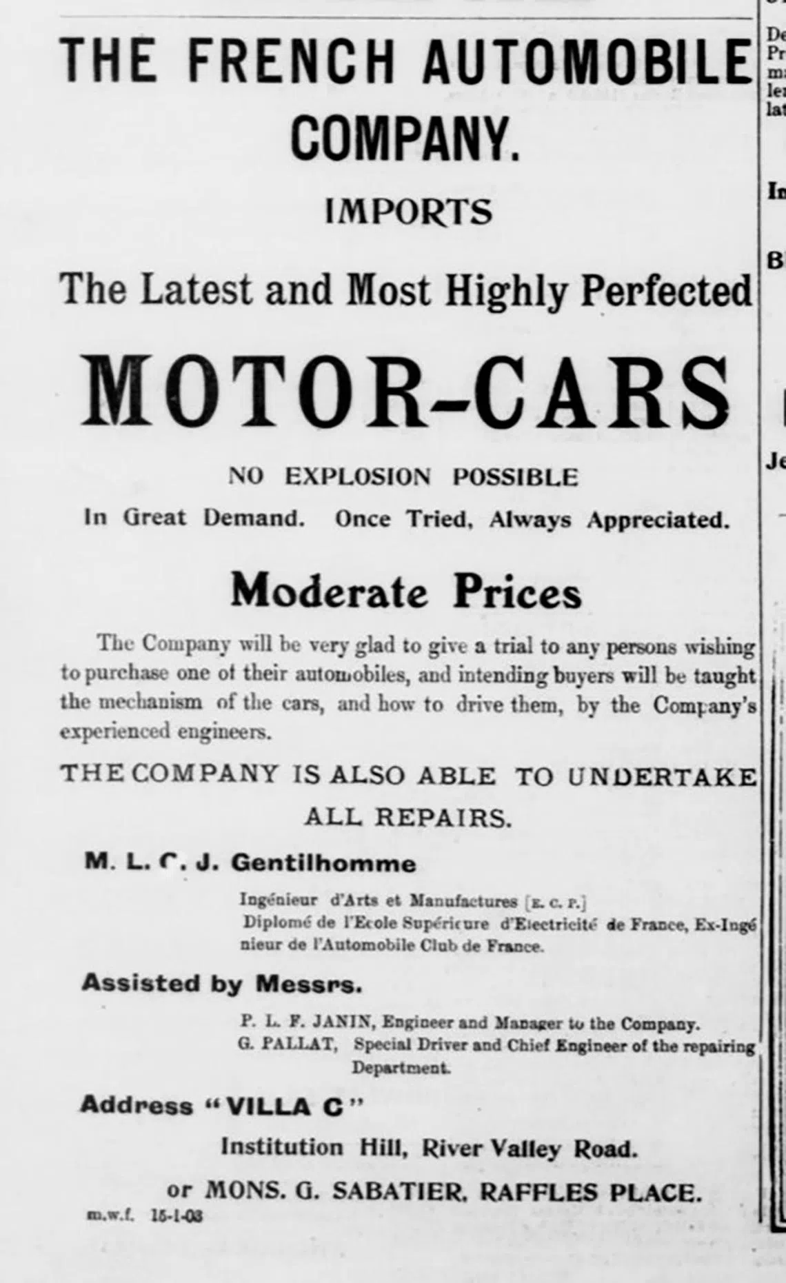 By 1902, advertisements for cars began appearing, such as one by The French Automobile Company offering trials to potential customers, including teaching them how the cars’ mechanisms work. “No explosion possible”, read the ad on Page 6 of the Sept 12 edition. “In great demand”, it also proclaimed. “Once tried, always appreciated.”