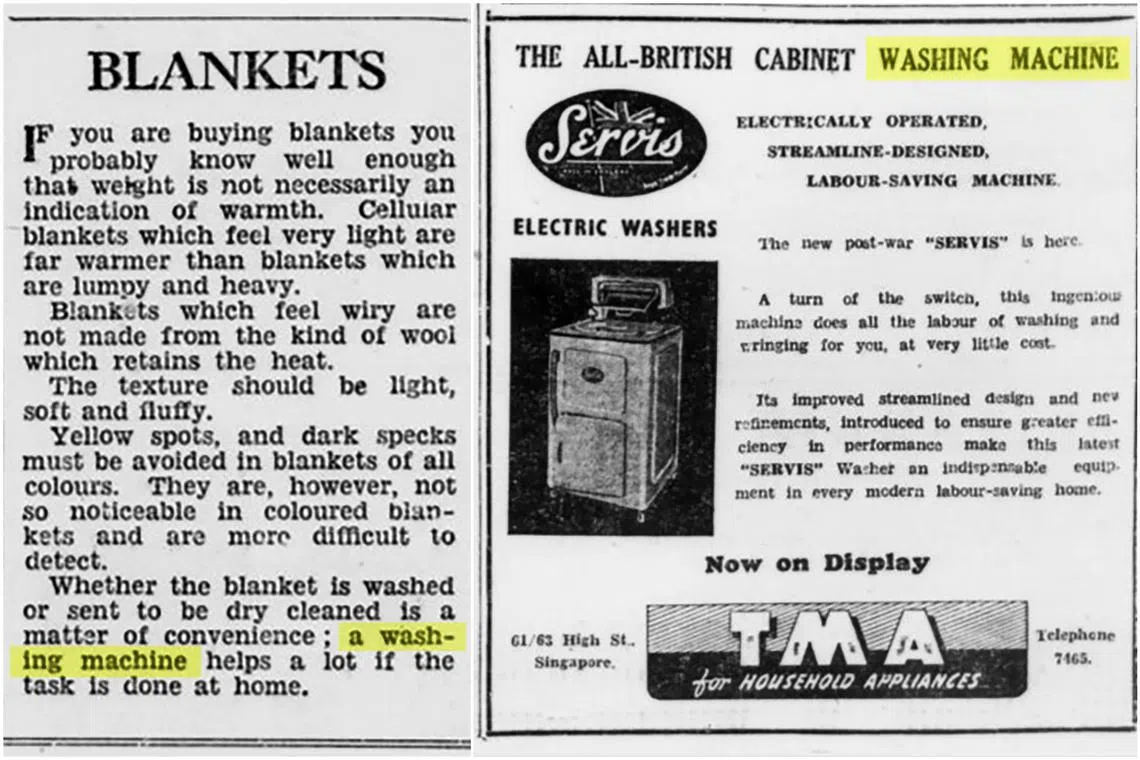 An article on Dec 4, 1938, in The Sunday Times lamenting the bane of “yellow spots and dark specks” on blankets (left), and an advertisement on Sept 15, 1946, for an “all-British cabinet washing machine” from Servis (right).