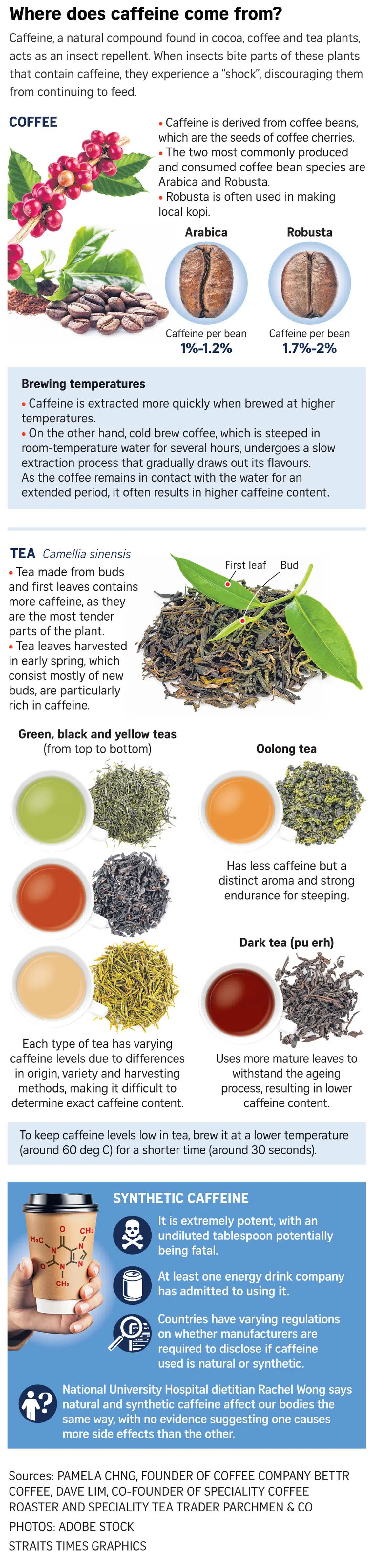 Ms Wong points out that caffeine content in coffee and tea can vary depending on how they are prepared. Bubble tea, which uses tea as its base, also contains caffeine but not as much as coffee. Nonetheless, the addition of ingredients such as pearls, syrup and sugar poses other health risks.