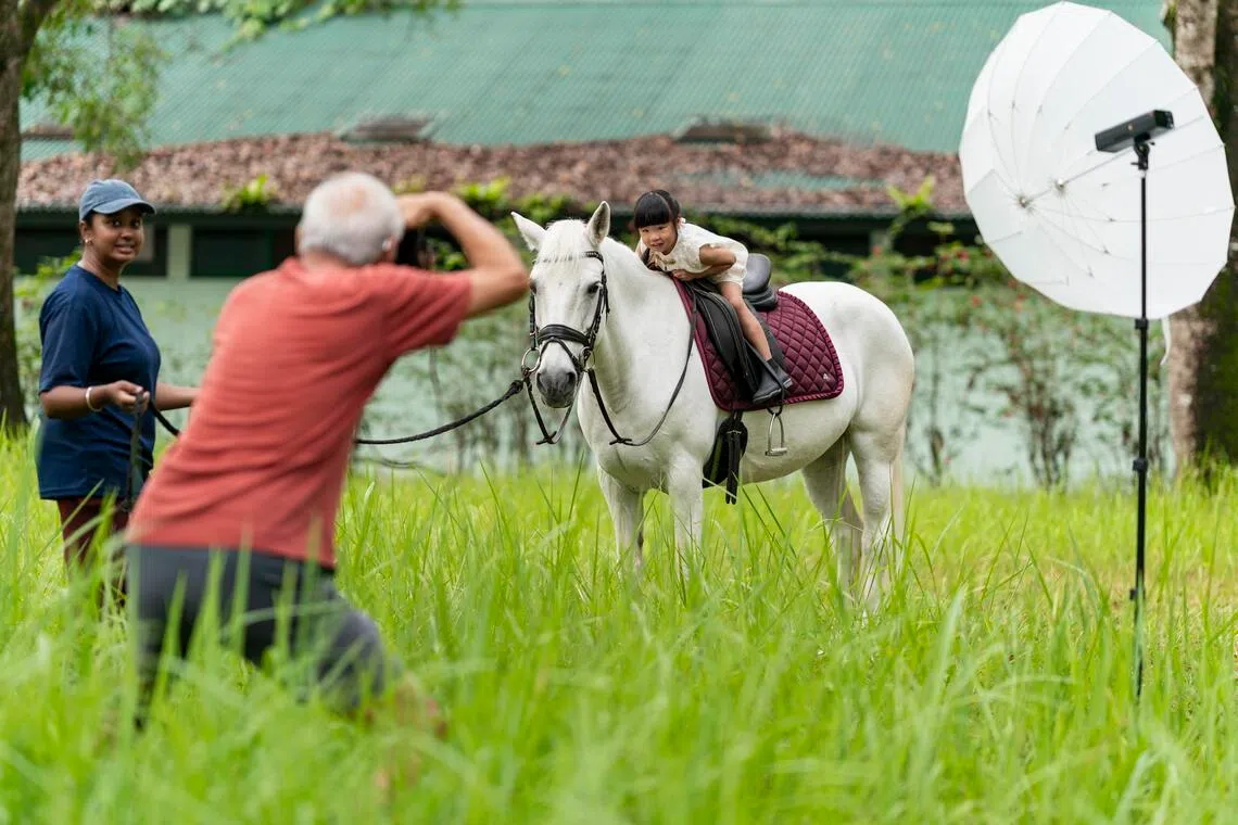 Amateur photographer Teo Pok Zin photographing five-year-old Zaelyn Ting sitting on Molly, a 19-year-old horse, at Bukit Timah Saddle Club on Feb 18. The club’s events executive, Ms Pavethra Maya, is holding on to Molly’s lead rope.