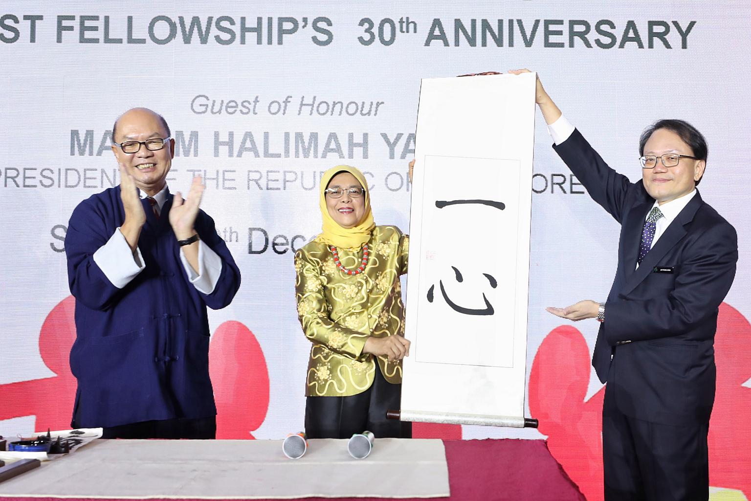 President Halimah Yacob holding up her Chinese calligraphy,which means "one heart", flanked by calligrapher Lim Joon Hiang (left) and Buddhist Fellowship president Lim Phang Hong at the Buddhist Fellowship’s 30th Anniversary dinner on Dec 30, 2018.