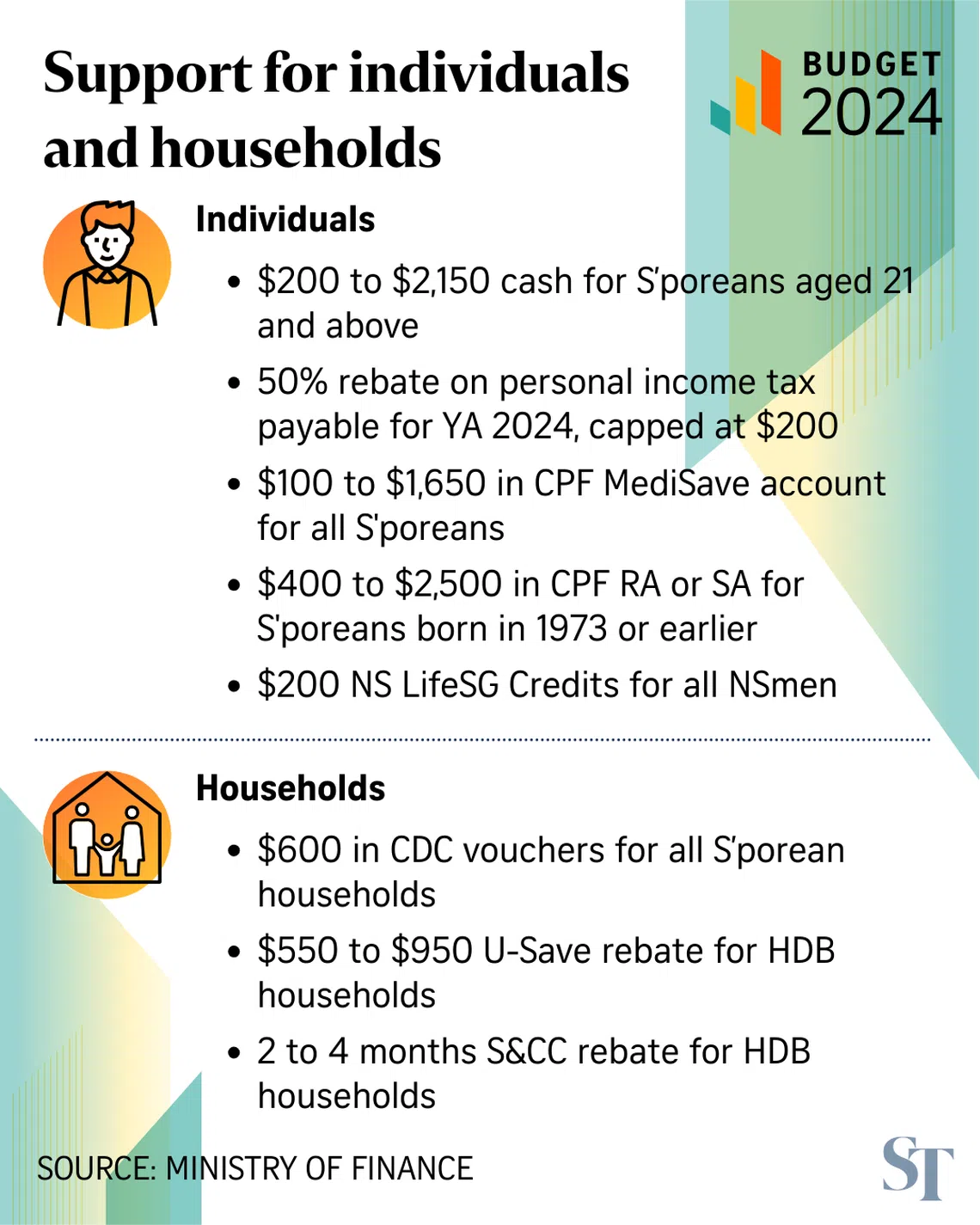 A Cost-of-Living Special Payment of between $200 and $400 in cash will be given to eligible Singaporeans in September 2024. To qualify, people must be aged 21 and above in 2024, reside in Singapore, own not more than one property and have an assessable income of up to $100,000. This will benefit about 2.5 million adult Singaporeans.