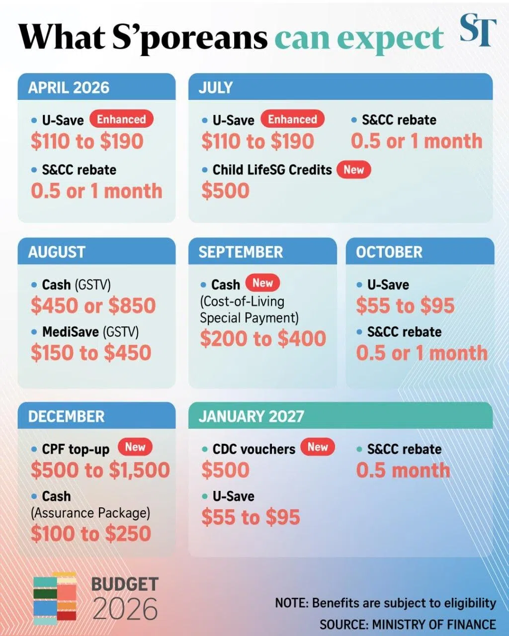 More broadly, he also announced a Cost-of-Living Special Payment for eligible Singaporeans, more U-Save rebates to help with utilities expenses, and $500 in CDC vouchers to be issued to all Singaporean households in January 2027.
