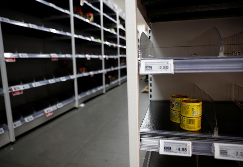 In a photo taken on Feb 8, 2020, cans of food are left on empty shelves in a supermarket as people stock up on food supplies after Singapore raised coronavirus outbreak alert level to orange.