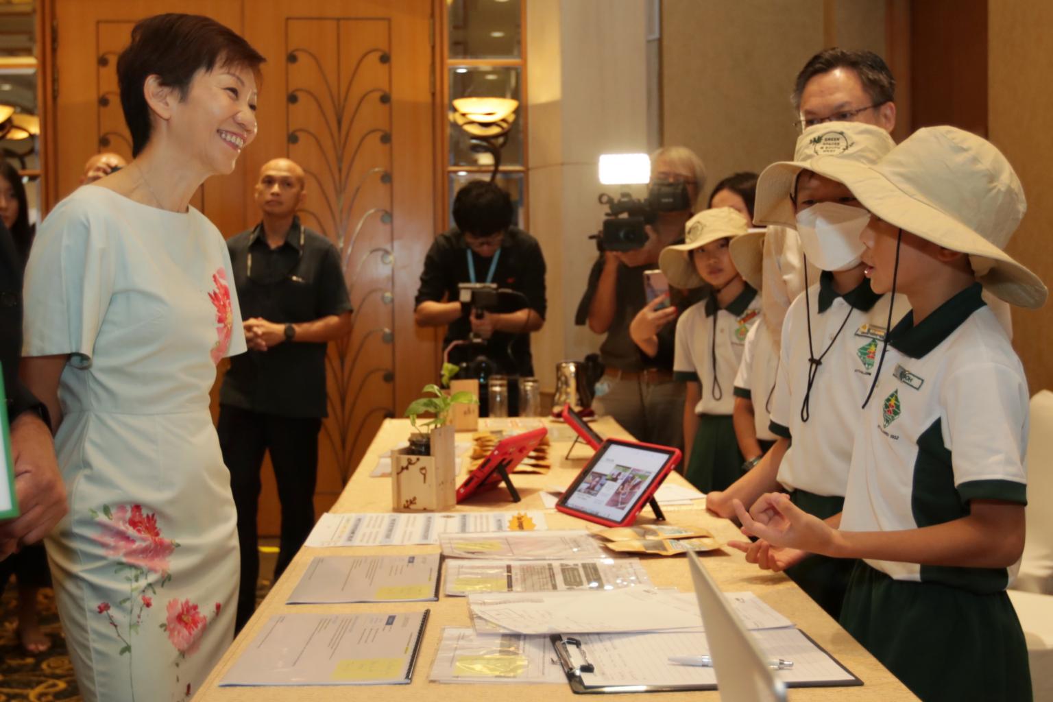 Minister for Sustainability Grace Fu speaking with pupil Ray Goh during her tour at the Environment Forum 2022 on Sept 19.