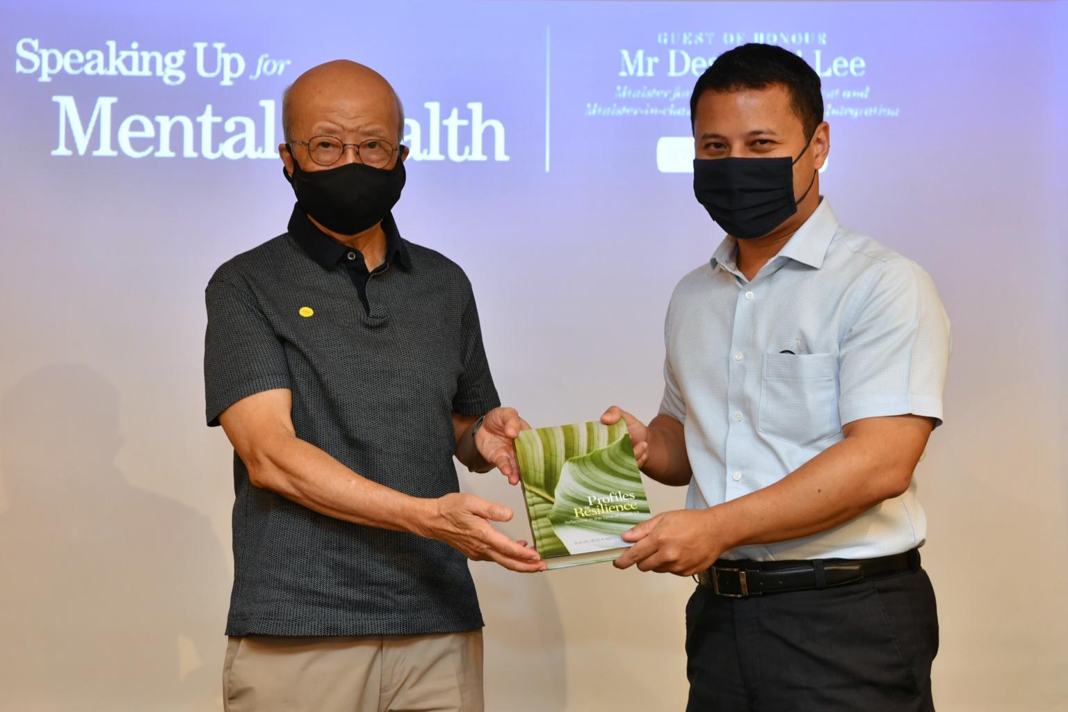 NUHS Mind Science Centre chairman Cheong Choong Kong (left) with National Development Minister Desmond Lee during the launch of the centre's new book.