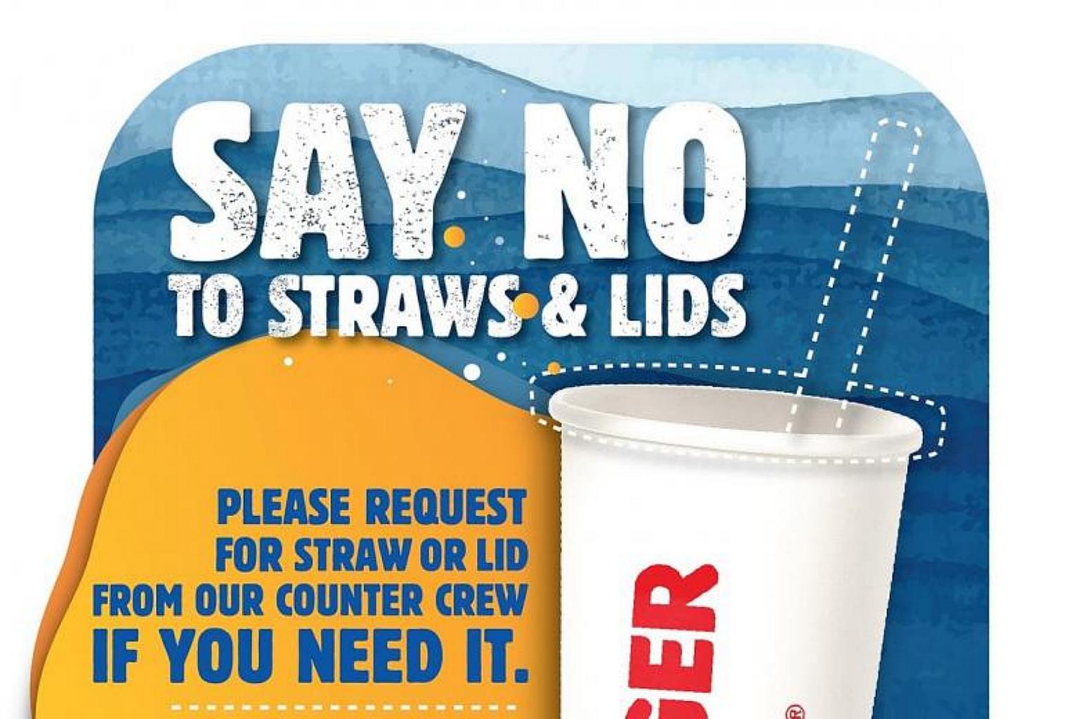SINGAPORE (THE NEW PAPER) - Fast-food chain Burger King has stopped giving dine-in customers straws and plastic lids for cold drinks in its 42 outlets here as of Monday (Oct 15).