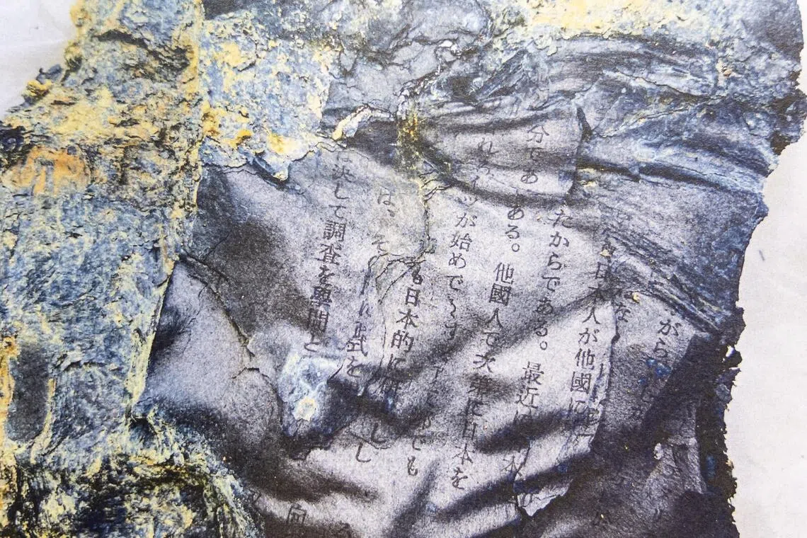 A close-up of a printout picture of the carbonized Japanese literature found during a 2021 excavation.