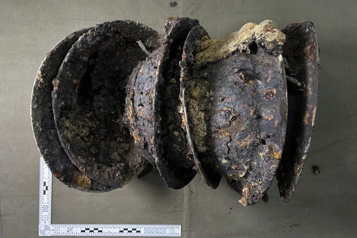 A photo, taken in a lab after the British helmets were recovered, showing how they were stacked on top of each other when found.