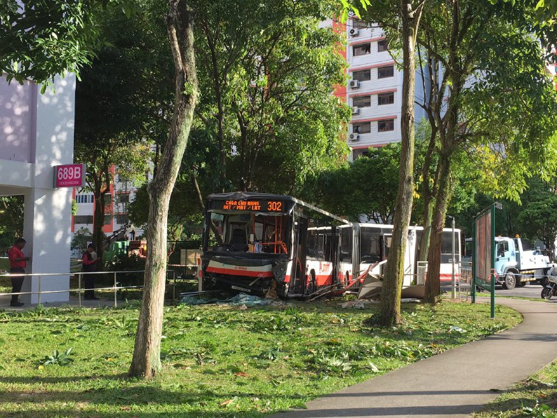 The SMRT bendy bus, service number 302, had crashed onto the pavement near the HDB block and the windscreen was shattered.