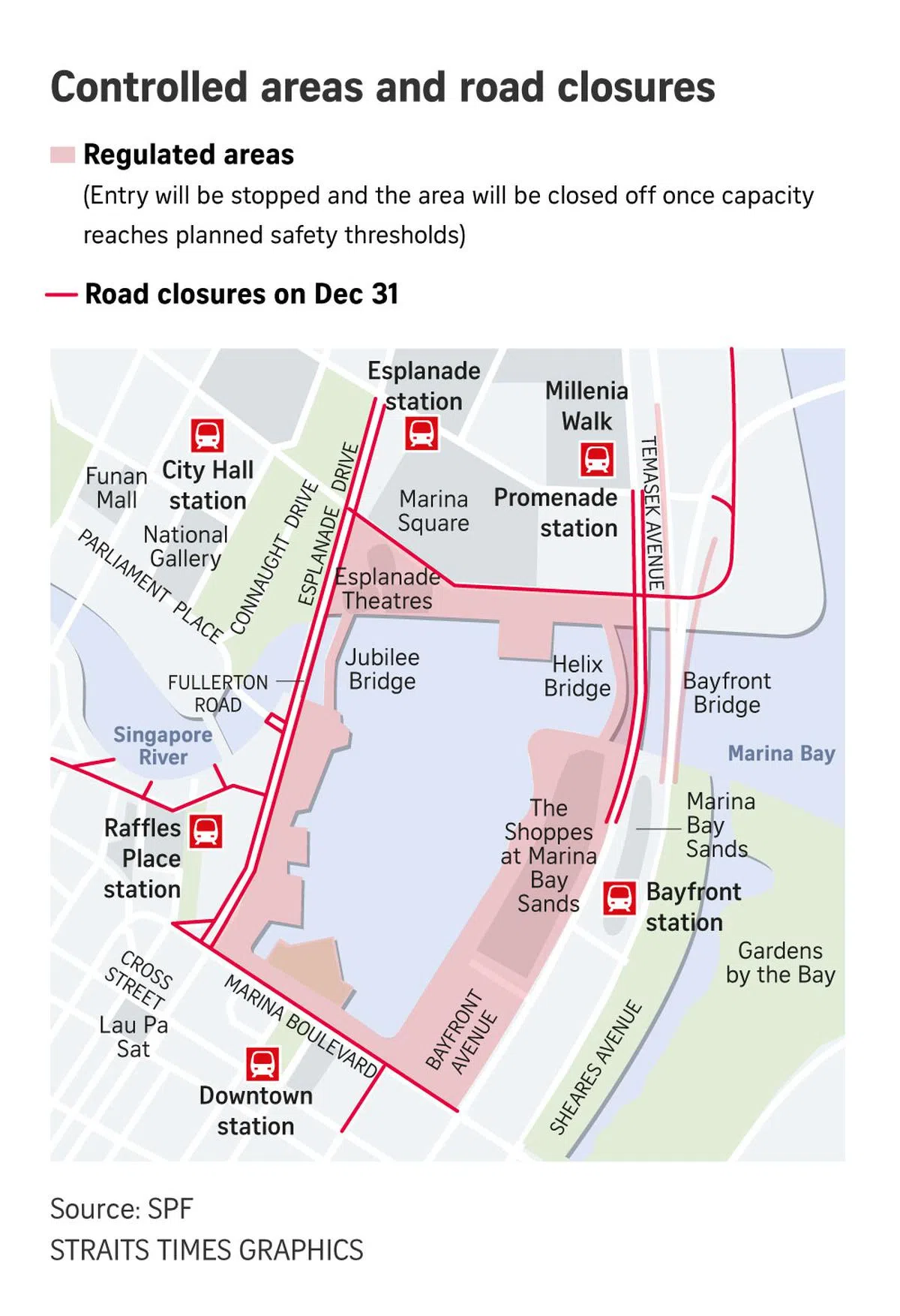 Go-Ahead bus services 36 and 518 will also be affected, skipping stops along Bayfront Avenue, Raffles Avenue, Raffles Boulevard, Temasek Avenue and Temasek Boulevard from 6pm till the end of bus operations.