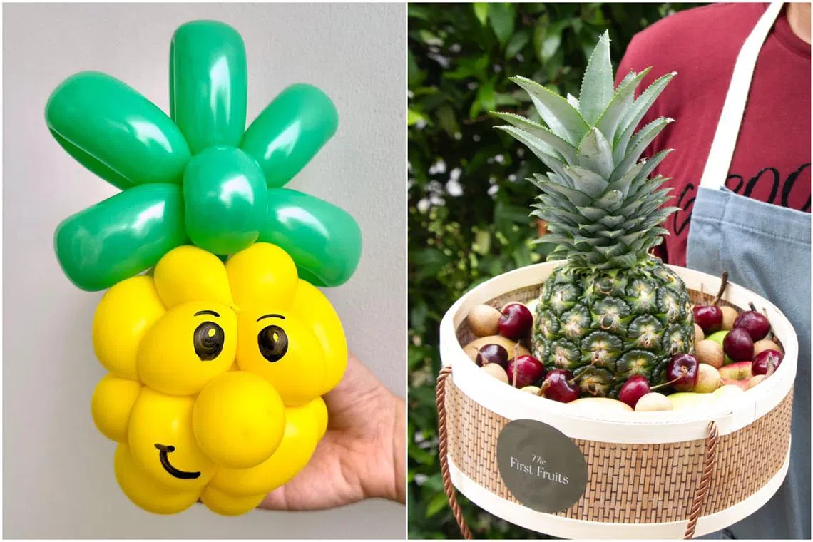 Happyairheads’ pineapple balloon and The First Fruits’ fruit hamper.