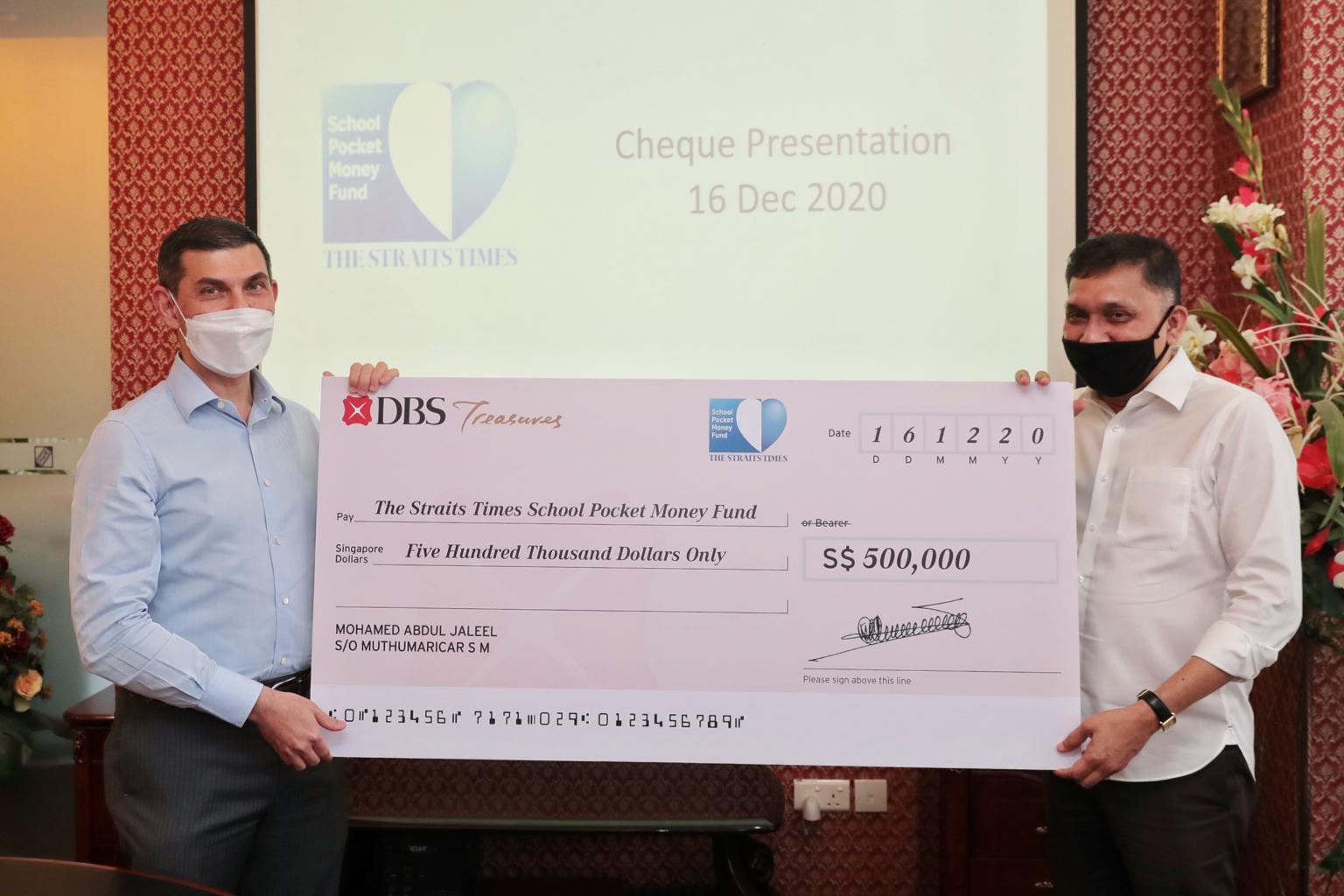 Mr Jaleel presented The Straits Times School Pocket Money Fund with a $500,000 cheque on Wednesday (Dec 16), bringing the total amount donated by him since 2010 to $4.5 million.