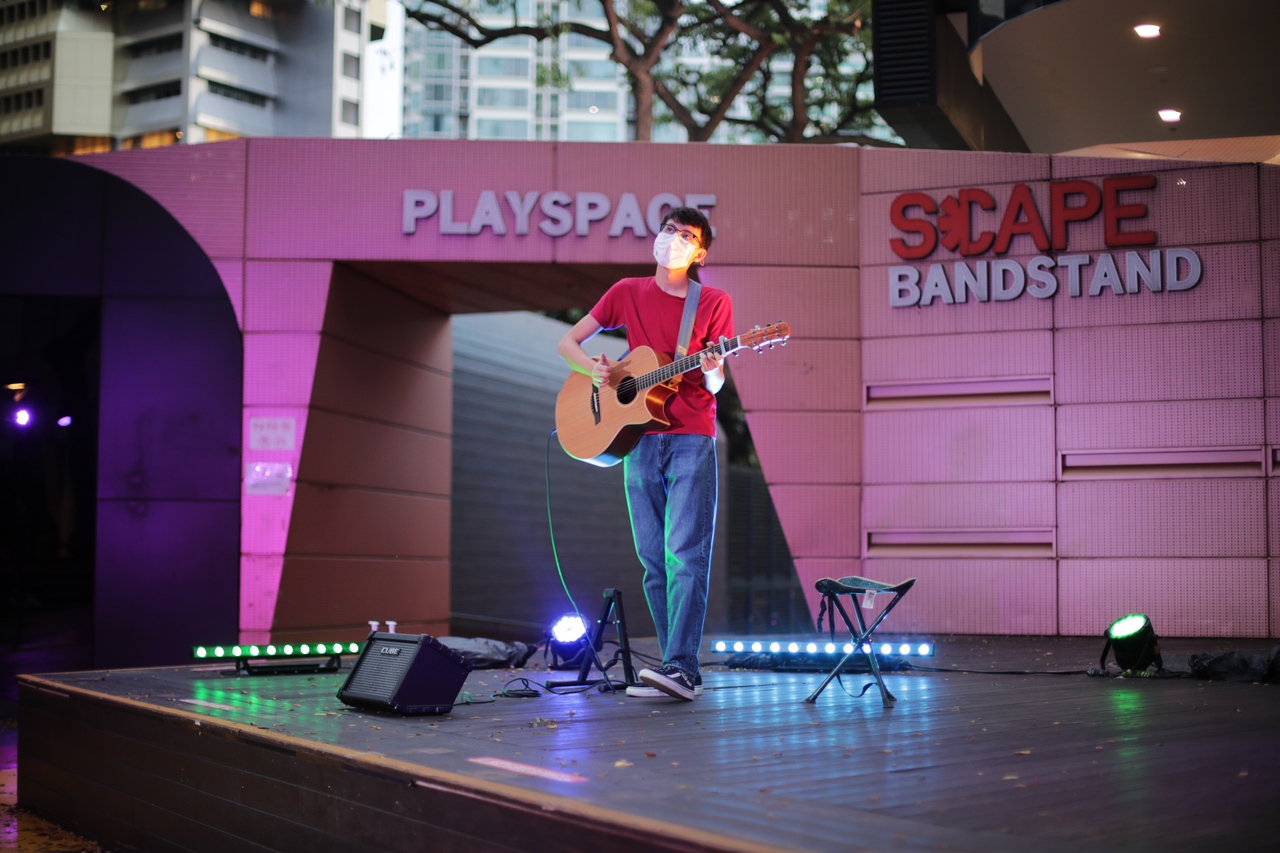 Alan Ang, 21, guitarist performs at the SCAPE bandstand during the live pilot busking session on Dec 5, 2020.