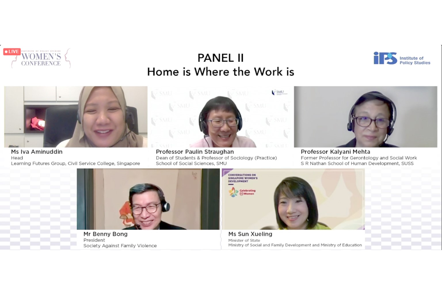 Clockwise from top left: Ms Iva Aminuddin, head of the learning futures group at Civil Service College, Singapore; Prof Paulin Straughan, sociologist at Singapore Management University; Dr Kalyani Mehta, former professor for gerontology and social work at the Singapore University of Social Sciences; Minister of State for Education and Social and Family Development Sun Xueling; and Mr Benny Bong, president of the Society Against Family Violence.