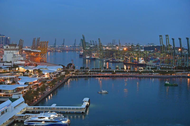 VivoCity on mainland Singapore (left) with the bridge to Sentosa and Pulau Brani in the foreground.