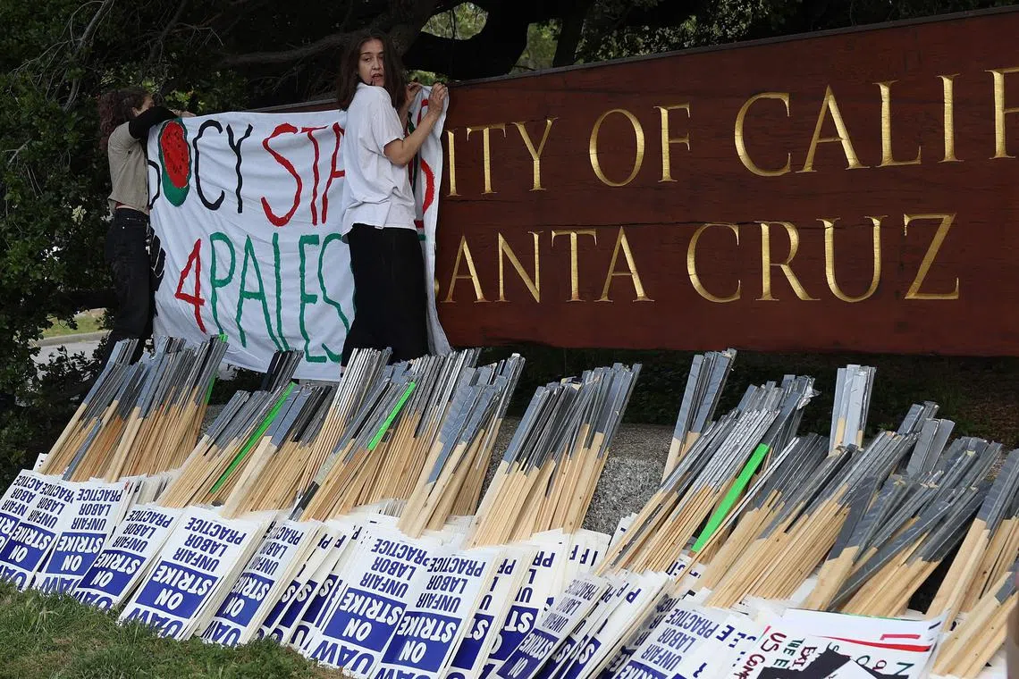 Protesters set up a sign in front of the University of California, Santa Cruz campus on May 20.