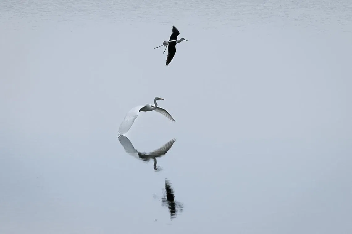 A black-winged stilt flying over an egret, above a partially-filled cell on Phase 1 of the landfill. More than 80 species of birds have made Semakau Landfill their home.