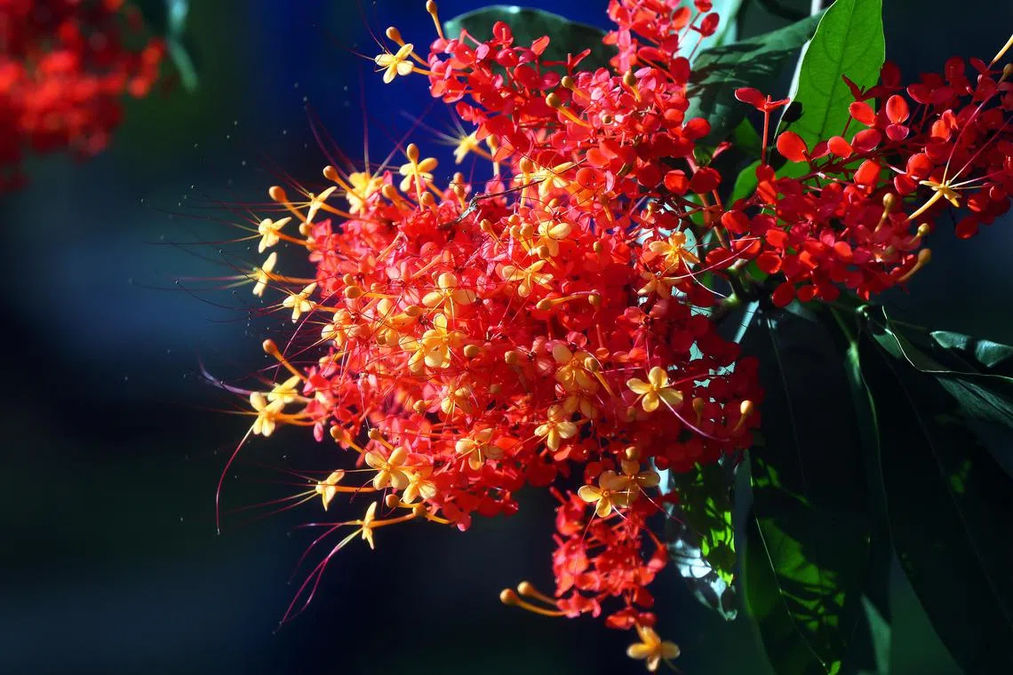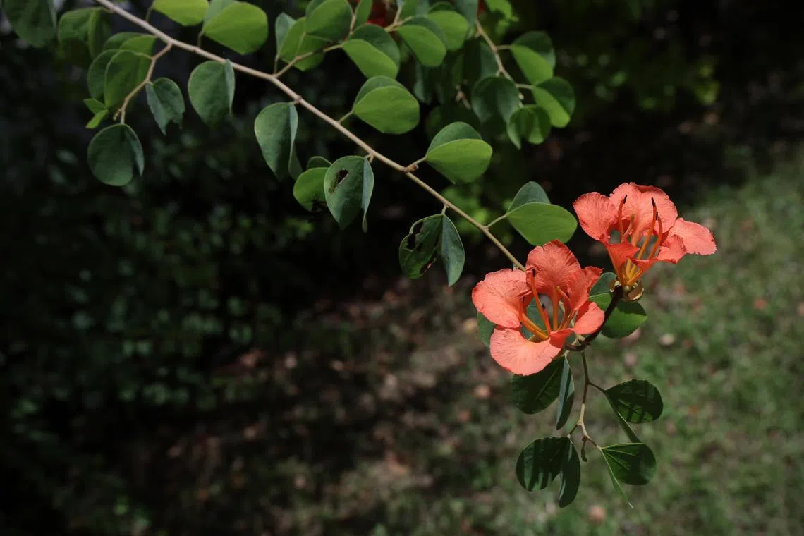 The tree, which is also known as sorrowless tree, has flowers with four roundish petals and long stamens (pollen-producing part of a flower).