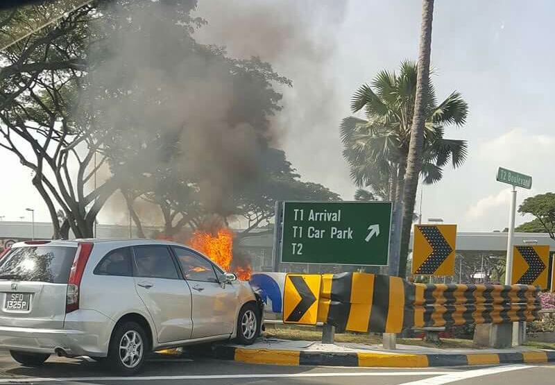 A silver Honda caught fire after it crashed into a road divider near Changi Airport on Monday (July 24).