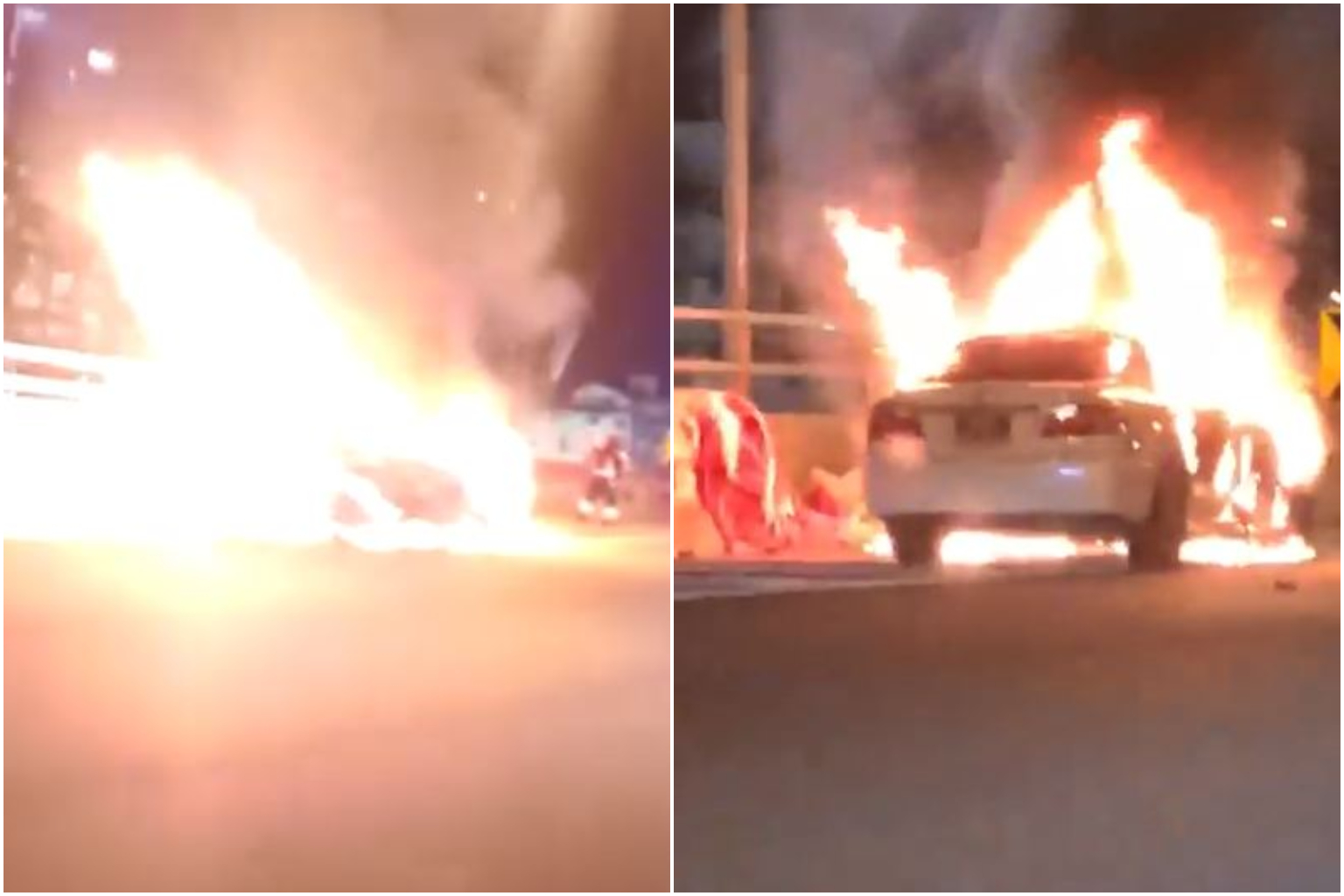 A video uploaded to Facebook shows the car parked on the left road shoulder, with the front half of the vehicle engulfed in flames.