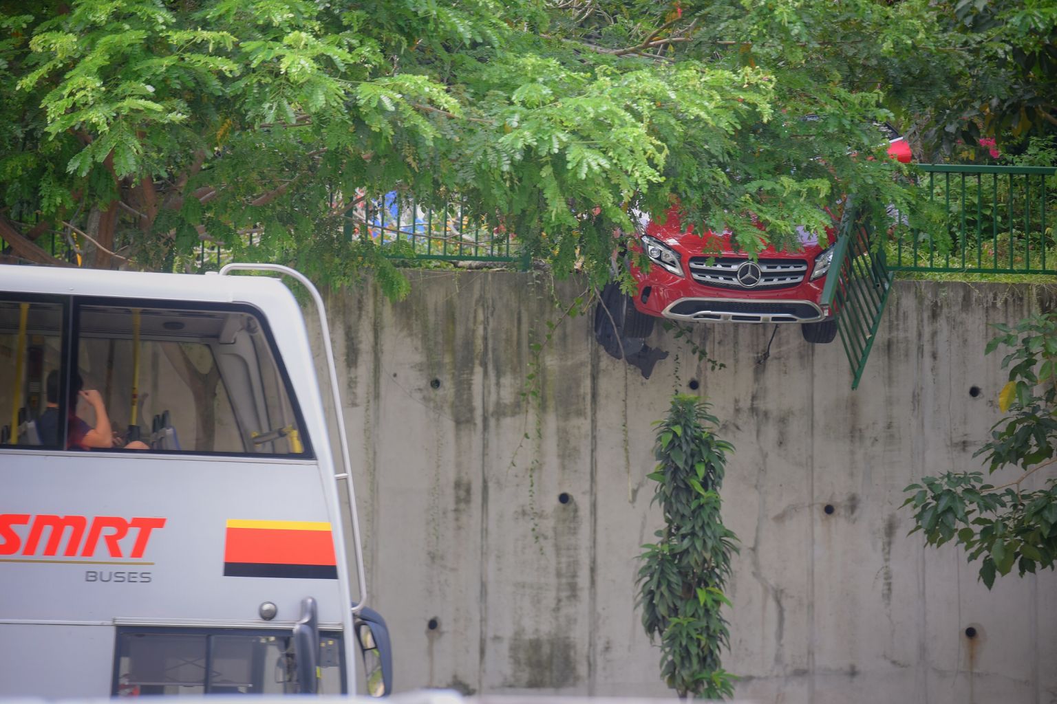 SINGAPORE - A woman who just wanted to buy flowers got more than she bargained for when her car crashed through a barrier, leaving her and her passengers hanging 6m above busy Clementi Road on Wednesday (April 28).