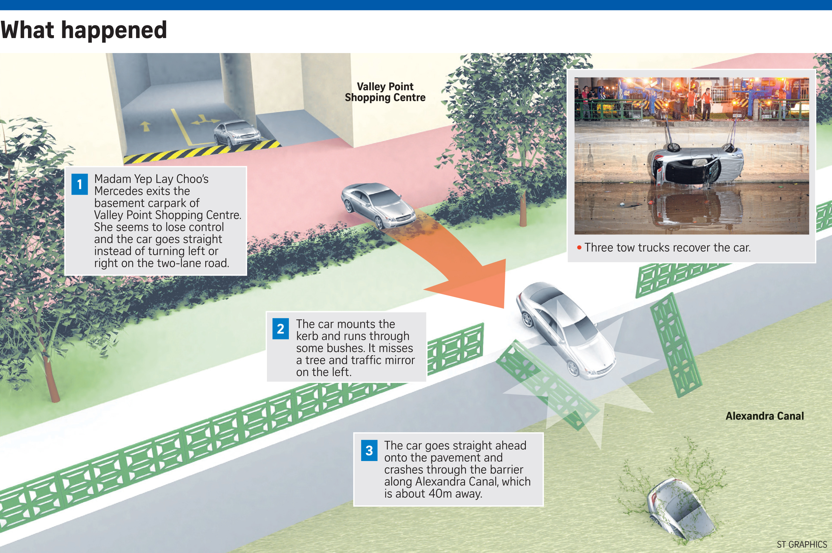 Instead, Madam Yep's car went straight ahead, mounting a kerb and running through several bushes before crashing through the metal barriers and into Alexandra Canal.