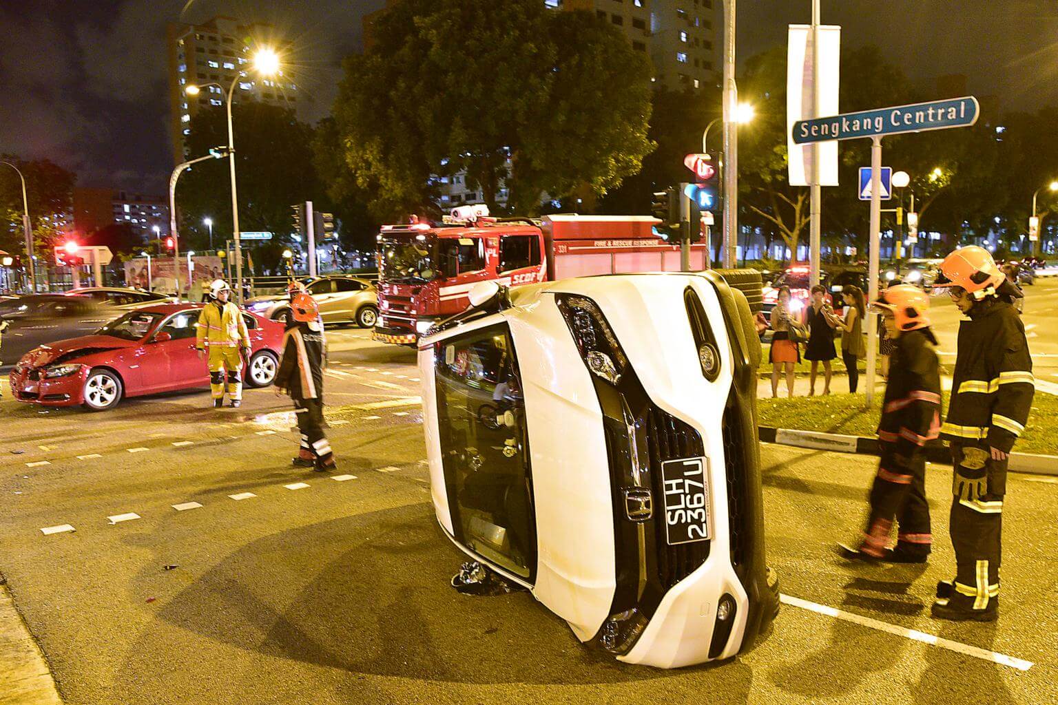 SINGAPORE - A collision at the junction of Buangkok Drive and Sengkang Central left a white Honda on its side on Tuesday (Aug 29) night. No one was injured.