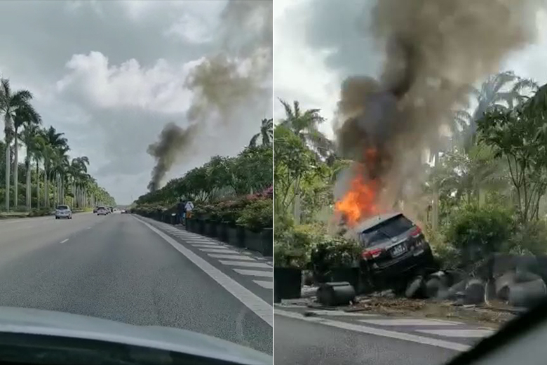 The accident happened on the expressway in the direction of Changi Airport, after the Bayshore exit. A video from a dashboard camera circulating online shows a car lodged in the shrubbery along the divider, with black smoke billowing from it.