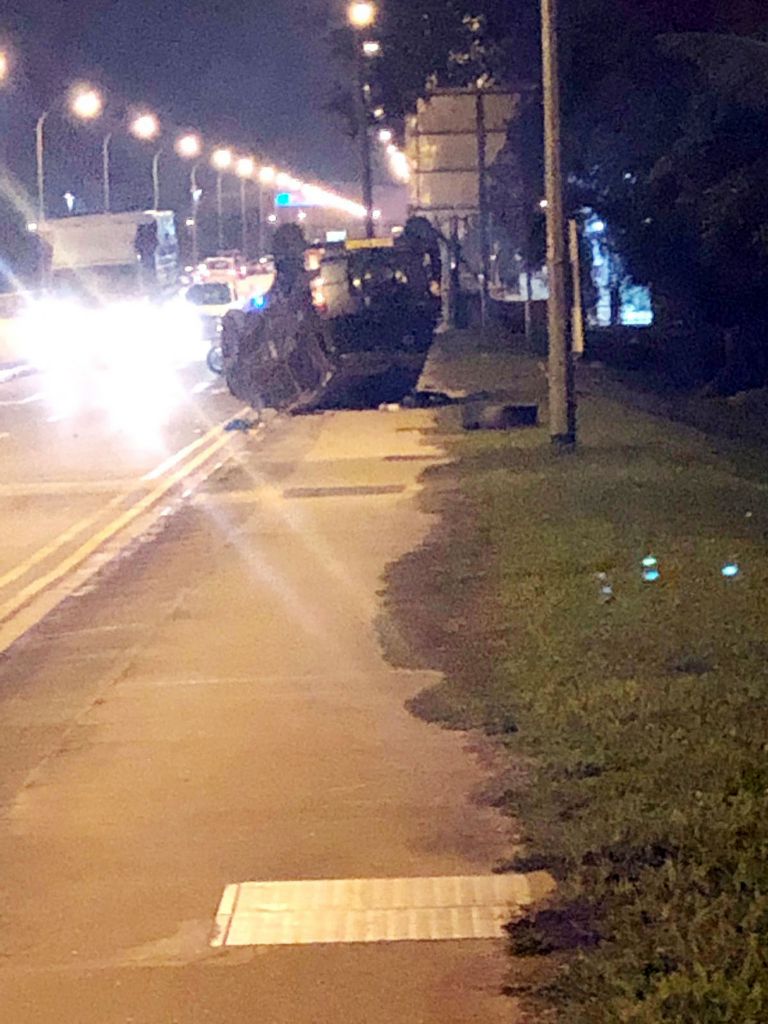 Photos sent to citizen journalism website Stomp show the overturned car at the side of the road.