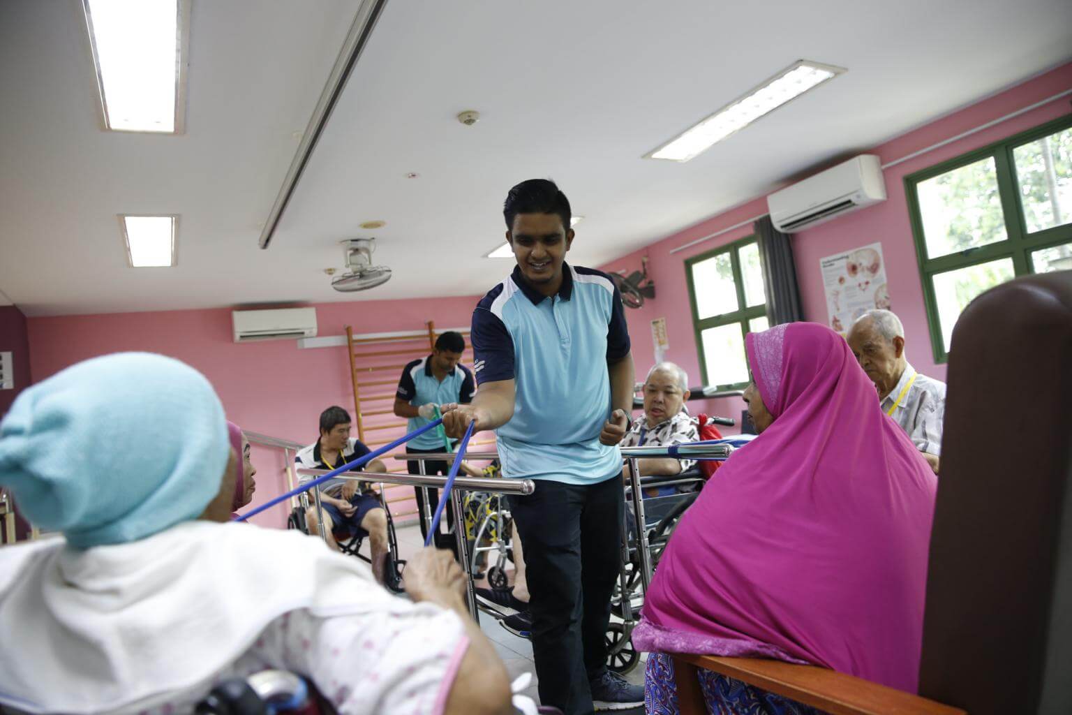 Therapy Assistant Muhammad Muhaza, 23, engaging with elderly residents in a mass therapy session. Care workers are paid lower than receptionists and sales assistants, jobs that require similar educational qualifications.