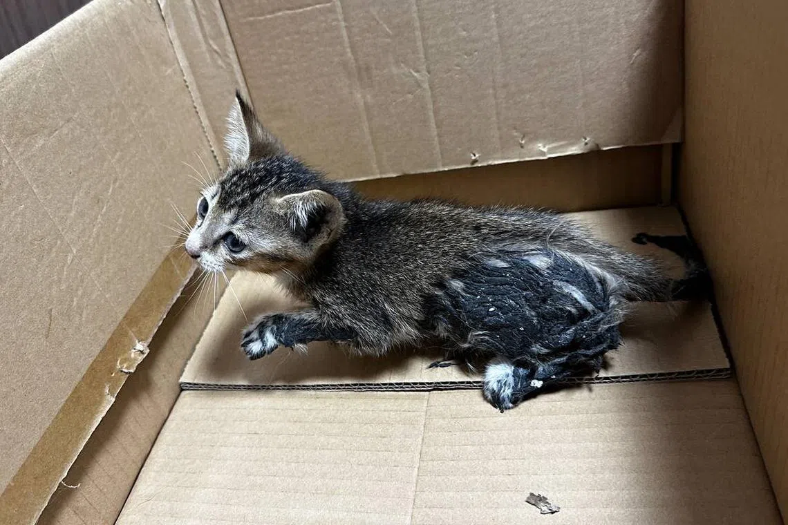 One of the kittens found allegedly abandoned in a cardboard box in Yishun Avenue 9 in June 2024 was covered in a black, glue-like substance.