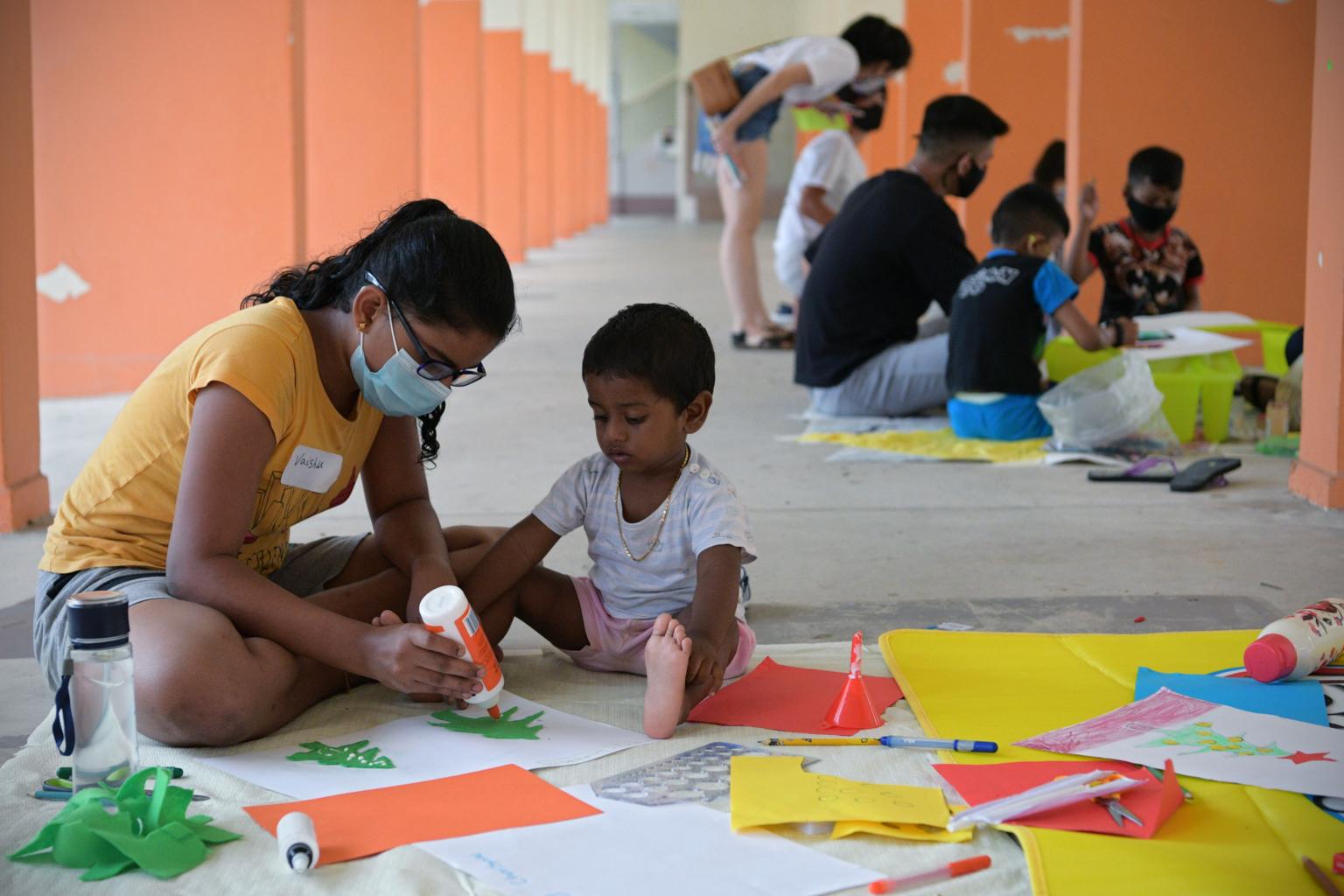 Children from rental blocks engage in art and craft activities under 6th Sense Singapore.
