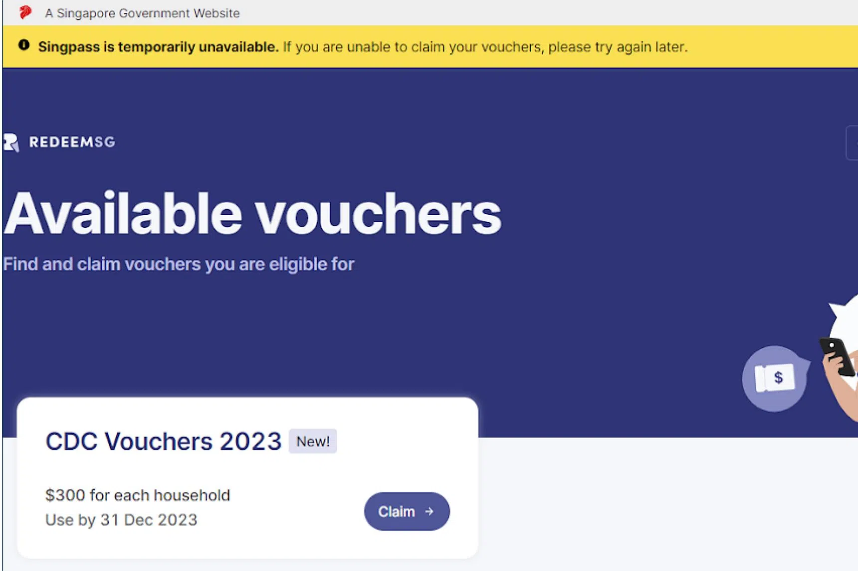 A yellow banner on the CDC voucher redemption website was put up as early as 12:30pm, prompting users who tried to log in with Singpass to try again later if they are unable to claim their vouchers.