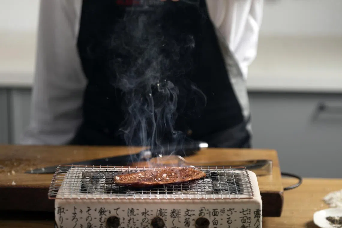 The cultivated thin-cut steak being cooked. The steaks will be priced similar to what ultra-premium beef costs in the market.