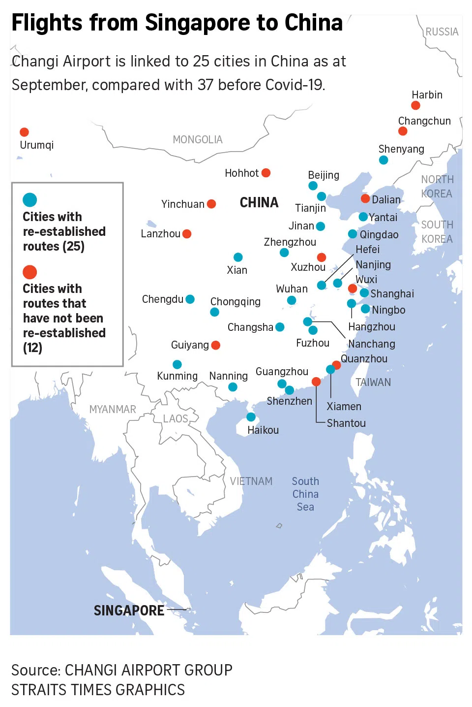 As at September, passengers can fly to 25 Chinese cities from Changi and vice versa, compared with 37 in January 2020.