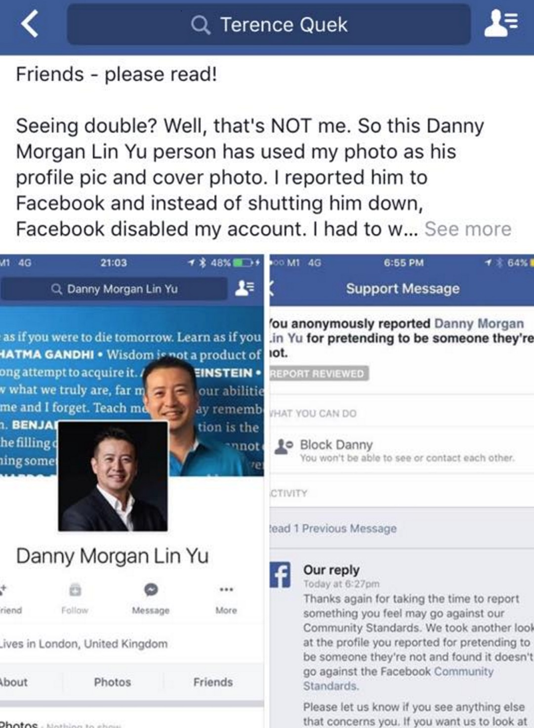 But things did not go as planned for Mr Quek. The Facebook team which reviewed the complaint told him that the fake profile had not violated community standards, and so it remained.