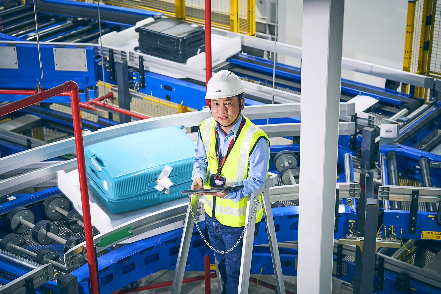 Mr Philip Su (right), project director of Changi Airport’s Terminal 2 expansion project, worked closely with baggage handling system senior manager Lim Hon Wei to ensure that passengers’ check-in luggage is seamlessly processed and transported.