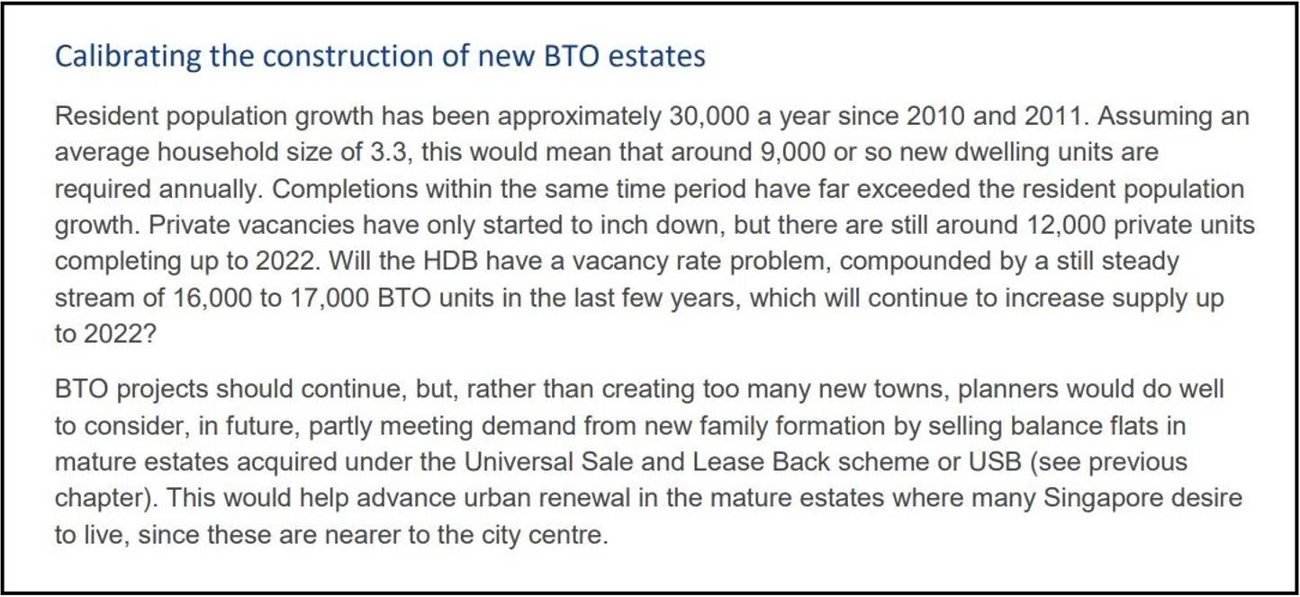 “The first paragraph makes observations about the risk of vacancies in the context of a paper on longer-term housing dynamics that resale prices will inevitably come under pressure at some point... But the call to action comes in the second paragraph, which says, BTO projects should continue,” he said.