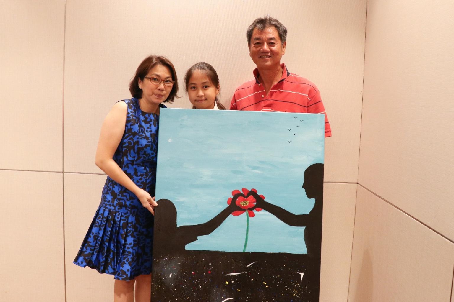 (From left) Marie Huang, Matilda Huang Yu Jing, Jimmy Khoo Eng Chew. Mr Khoo (right) bought the painting during the auction for $1,200 from the artists, Matilda and her mother Mrs Huang.