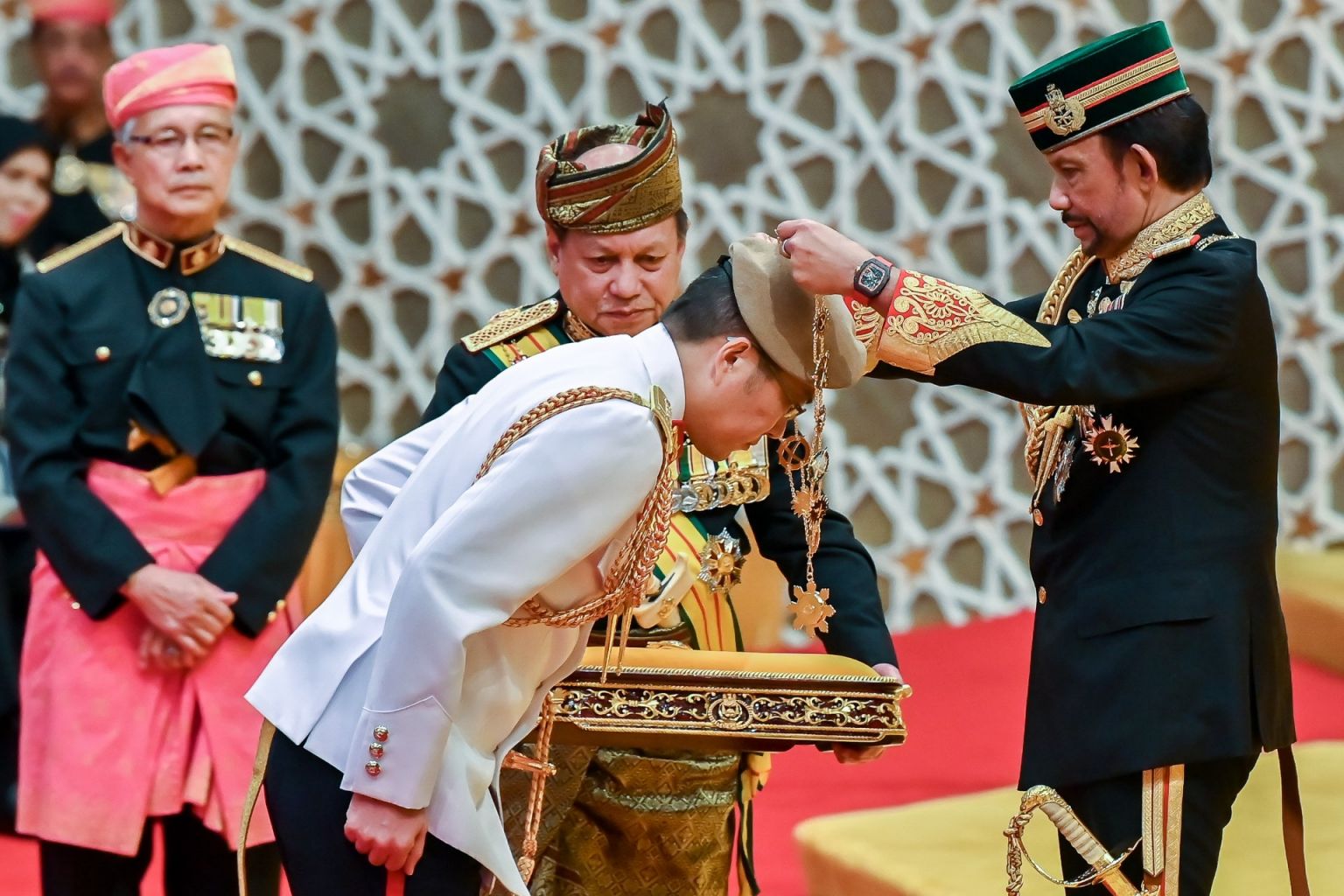 Brunei Sultan Hassanal Bolkiah conferring the Most Exalted Order of Paduka Keberanian Laila Terbilang - First Class on Chief of Defence Force Melvyn Ong at the Istana Nurul Iman in Brunei.