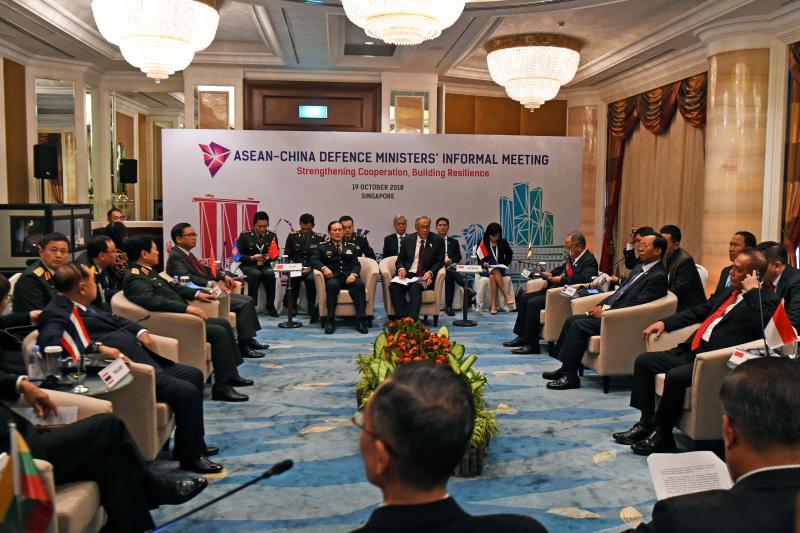 Defence Minister Ng Eng Hen with China's Defence Minister Wei Fenghe at the Asean-China Defence Ministers' Informal Meeting in Singapore on Oct 19, 2018.