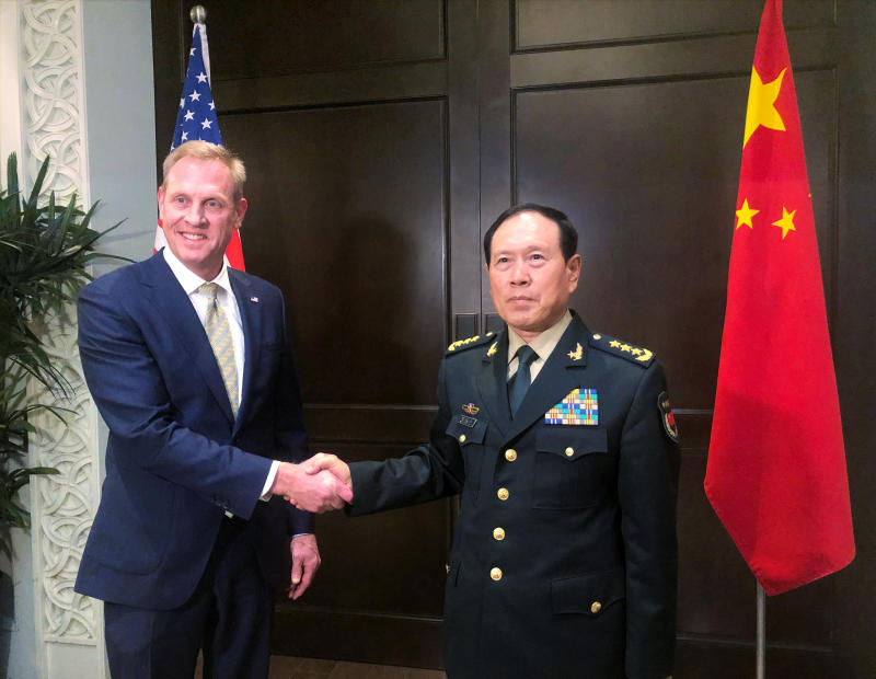 Chinese Defence Minister Wei Fenghe and acting US Defence Secretary Patrick Shanahan meeting on the sidelines of the Shangri-La Dialogue on May 31, 2019.