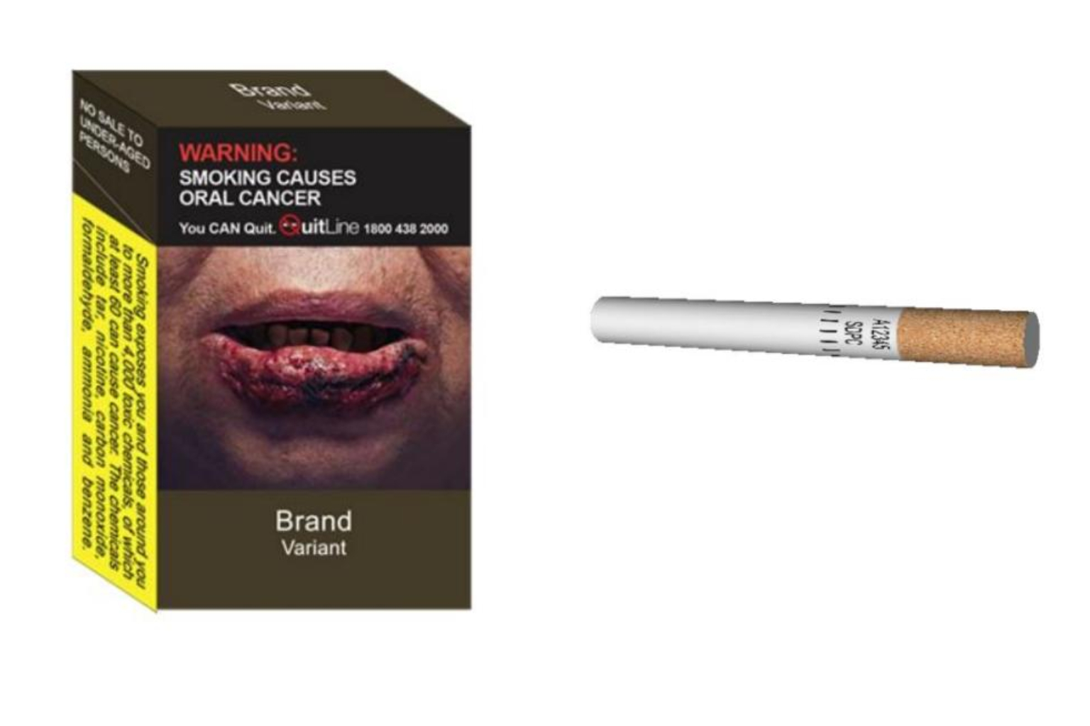 Cigarette packaging will not be allowed to show logos, colours, images or other promotional information associated with the tobacco brand. Product and brand names will be allowed in a standardised font style and colour similar to the illustration above.